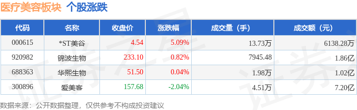证券之星消息,11月12日医疗美容板块较上一交易日下跌0.83%,爱美客领跌。当日上证指数报收于4000.14,下跌0.07%。深证成指报收于13240.62,下跌0.36%。医疗美容板块个股涨跌见下表: