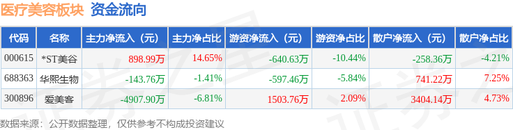 从资金流向上来看,当日医疗美容板块主力资金净流出4152.67万元,游资资金净流入265.67万元,散户资金净流入3887.0万元。医疗美容板块个股资金流向见下表:
