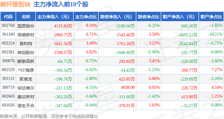 从资金流向上来看,当日碳纤维板块主力资金净流出8.55亿元,游资资金净流入6133.89万元,散户资金净流入7.94亿元。碳纤维板块个股资金流向见下表: