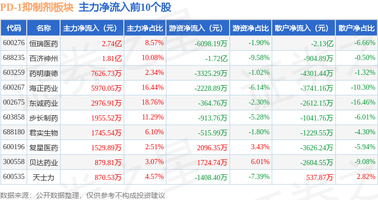 从资金流向上来看,当日PD-1抑制剂板块主力资金净流入5.9亿元,游资资金净流出2.89亿元,散户资金净流出3.01亿元。PD-1抑制剂板块个股资金流向见下表: