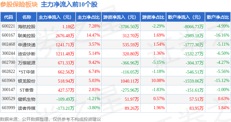 从资金流向上来看,当日参股保险板块主力资金净流出9.61亿元,游资资金净流入3.31亿元,散户资金净流入6.3亿元。参股保险板块个股资金流向见下表: