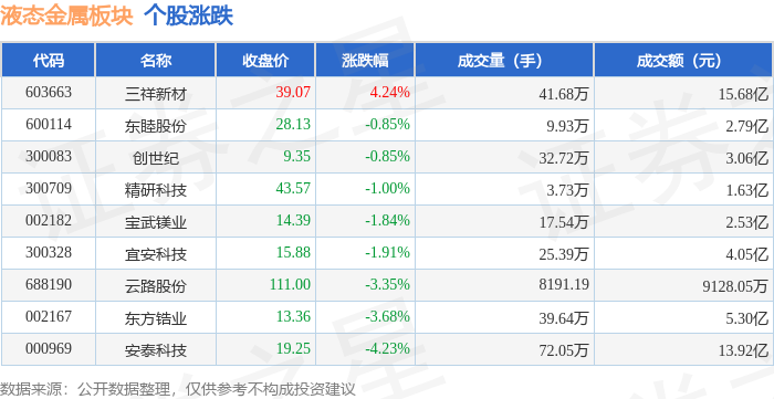 证券之星消息,11月12日液态金属板块较上一交易日下跌1.49%,安泰科技领跌。当日上证指数报收于4000.14,下跌0.07%。深证成指报收于13240.62,下跌0.36%。液态金属板块个股涨跌见下表: