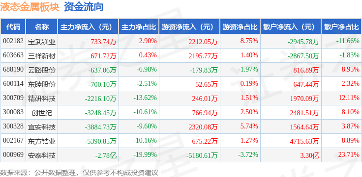 从资金流向上来看,当日液态金属板块主力资金净流出4.25亿元,游资资金净流入3108.29万元,散户资金净流入3.94亿元。液态金属板块个股资金流向见下表: