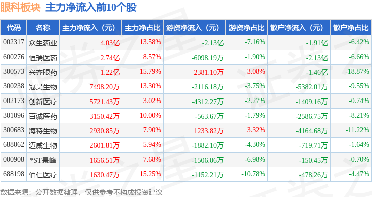从资金流向上来看,当日眼科板块主力资金净流入8.68亿元,游资资金净流出2.84亿元,散户资金净流出5.84亿元。眼科板块个股资金流向见下表: