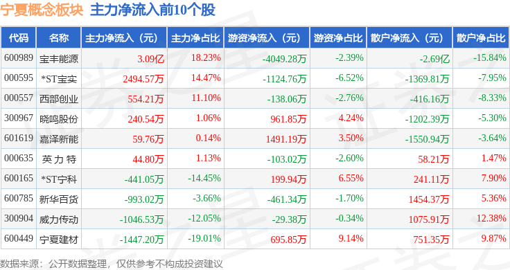从资金流向上来看,当日宁夏概念板块主力资金净流入1.4亿元,游资资金净流出1117.69万元,散户资金净流出1.29亿元。宁夏概念板块个股资金流向见下表: