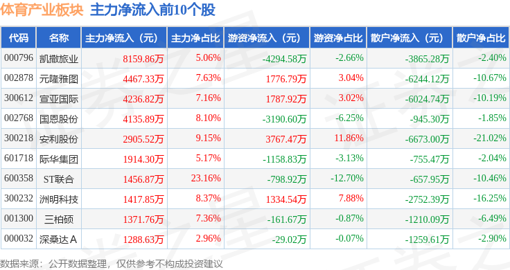 从资金流向上来看,当日体育产业板块主力资金净流出4.59亿元,游资资金净流入5084.68万元,散户资金净流入4.08亿元。体育产业板块个股资金流向见下表: