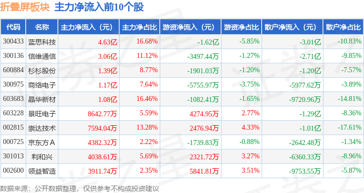 从资金流向上来看,当日折叠屏板块主力资金净流出15.54亿元,游资资金净流入7.5亿元,散户资金净流入8.04亿元。折叠屏板块个股资金流向见下表: