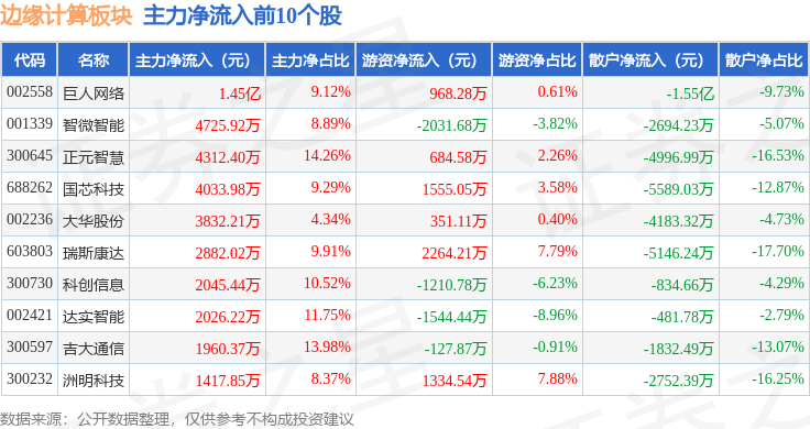 从资金流向上来看,当日边缘计算板块主力资金净流出30.54亿元,游资资金净流入8.83亿元,散户资金净流入21.7亿元。边缘计算板块个股资金流向见下表: