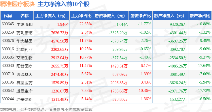 从资金流向上来看,当日精准医疗板块主力资金净流入3.11亿元,游资资金净流入726.06万元,散户资金净流出3.18亿元。精准医疗板块个股资金流向见下表: