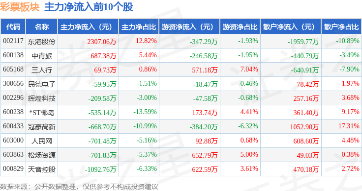 从资金流向上来看,当日彩票板块主力资金净流出2.11亿元,游资资金净流入6082.62万元,散户资金净流入1.51亿元。彩票板块个股资金流向见下表: