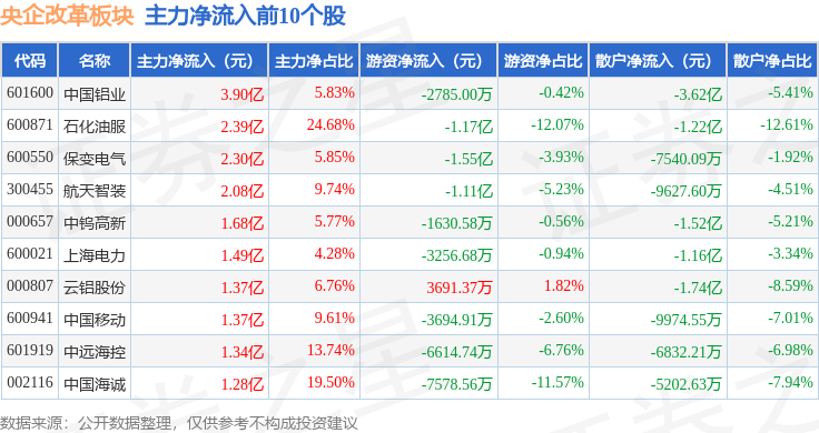 从资金流向上来看,当日央企改革板块主力资金净流出79.83亿元,游资资金净流入12.23亿元,散户资金净流入67.61亿元。央企改革板块个股资金流向见下表: