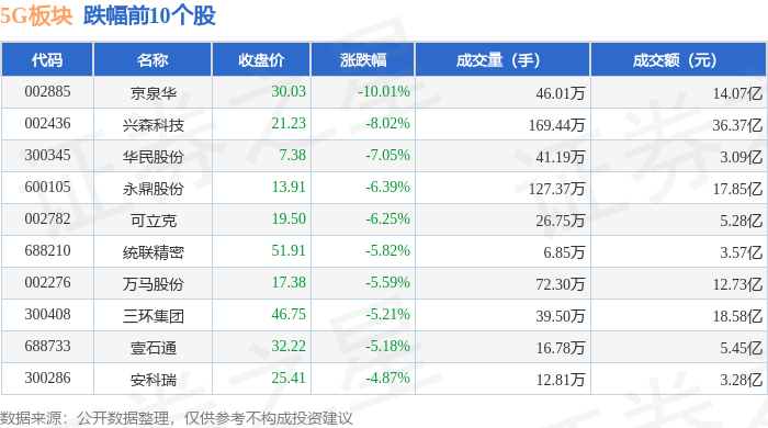 证券之星消息,11月12日5G板块较上一交易日下跌0.07%,京泉华领跌。当日上证指数报收于4000.14,下跌0.07%。深证成指报收于13240.62,下跌0.36%。5G板块个股涨跌见下表: