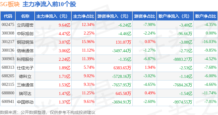 从资金流向上来看,当日5G板块主力资金净流出54.83亿元,游资资金净流出2.35亿元,散户资金净流入57.18亿元。5G板块个股资金流向见下表: