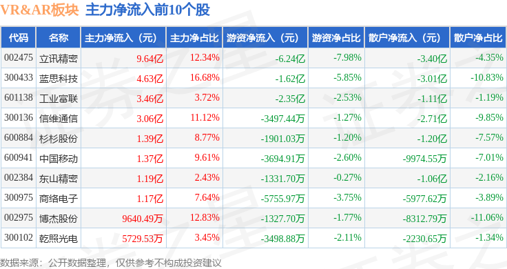 从资金流向上来看,当日VR&AR板块主力资金净流出13.3亿元,游资资金净流出1549.87万元,散户资金净流入13.46亿元。VR&AR板块个股资金流向见下表: