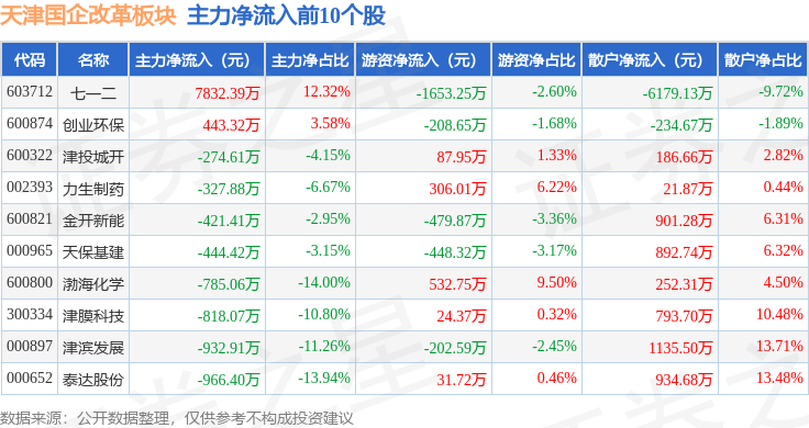 从资金流向上来看,当日天津国企改革板块主力资金净流出1.02亿元,游资资金净流出6655.86万元,散户资金净流入1.68亿元。天津国企改革板块个股资金流向见下表: