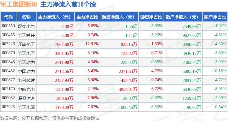 从资金流向上来看,当日军工集团板块主力资金净流出32.42亿元,游资资金净流入3.58亿元,散户资金净流入28.84亿元。军工集团板块个股资金流向见下表: