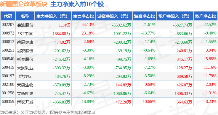 从资金流向上来看,当日新疆国企改革板块主力资金净流出2.54亿元,游资资金净流出3366.59万元,散户资金净流入2.88亿元。新疆国企改革板块个股资金流向见下表:
