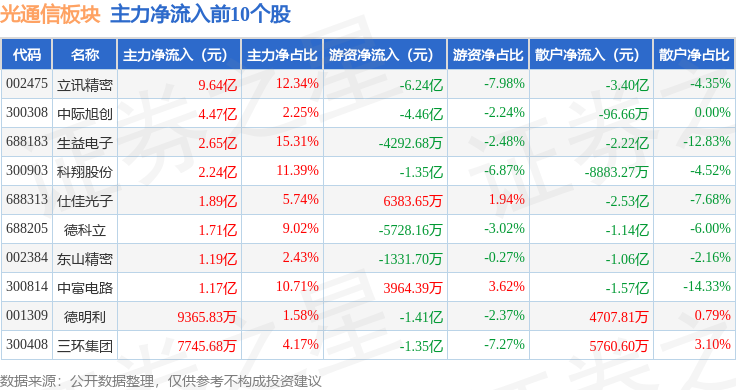 从资金流向上来看,当日光通信板块主力资金净流出28.33亿元,游资资金净流出12.44亿元,散户资金净流入40.77亿元。光通信板块个股资金流向见下表: