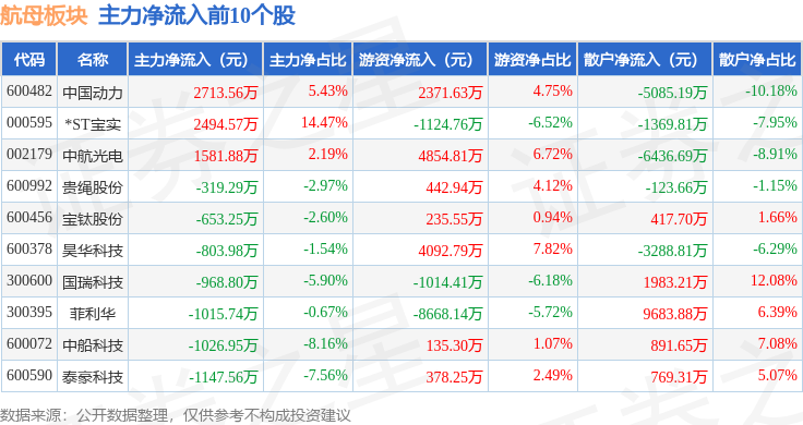 从资金流向上来看,当日航母板块主力资金净流出11.31亿元,游资资金净流入3.68亿元,散户资金净流入7.63亿元。航母板块个股资金流向见下表: