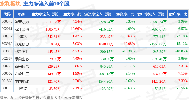 从资金流向上来看,当日水利板块主力资金净流出15.83亿元,游资资金净流入1.85亿元,散户资金净流入13.99亿元。水利板块个股资金流向见下表: