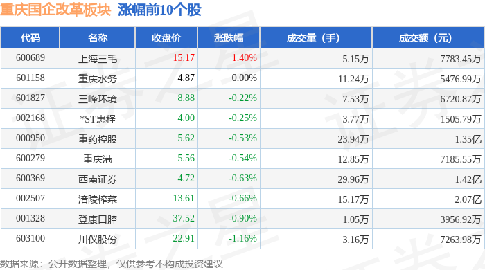 从资金流向上来看,当日重庆国企改革板块主力资金净流出1.4亿元,游资资金净流出5355.33万元,散户资金净流入1.93亿元。重庆国企改革板块个股资金流向见下表: