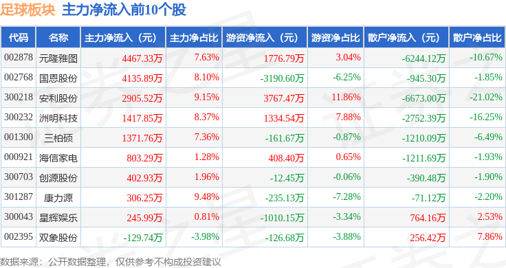 从资金流向上来看,当日足球板块主力资金净流出5.25亿元,游资资金净流入1.17亿元,散户资金净流入4.08亿元。足球板块个股资金流向见下表: