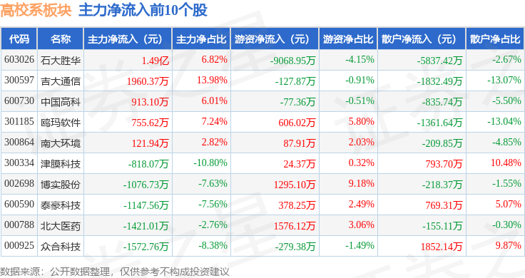 从资金流向上来看,当日高校系板块主力资金净流出9.25亿元,游资资金净流入1459.5万元,散户资金净流入9.1亿元。高校系板块个股资金流向见下表: