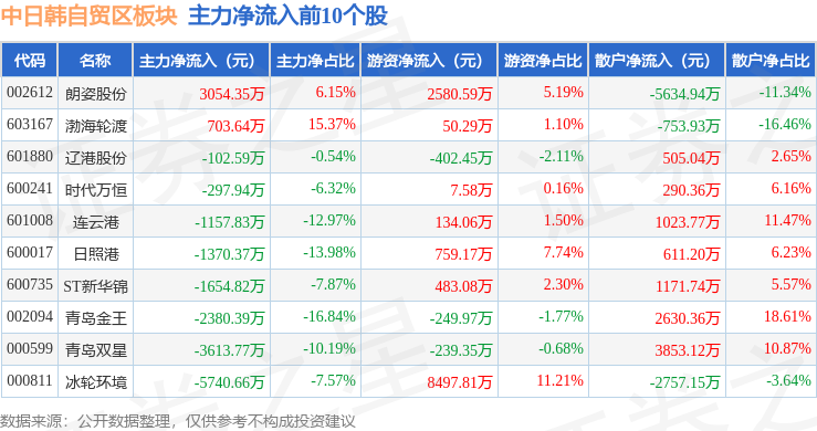 从资金流向上来看,当日中日韩自贸区板块主力资金净流出6.01亿元,游资资金净流入3.29亿元,散户资金净流入2.72亿元。中日韩自贸区板块个股资金流向见下表:
