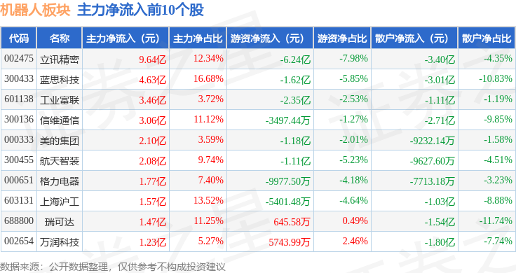 从资金流向上来看,当日机器人板块主力资金净流出82.46亿元,游资资金净流入14.25亿元,散户资金净流入68.22亿元。机器人板块个股资金流向见下表: