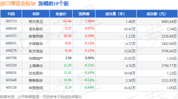 证券之星消息,11月12日进口博览会板块较上一交易日下跌0.35%,长江投资领跌。当日上证指数报收于4000.14,下跌0.07%。深证成指报收于13240.62,下跌0.36%。进口博览会板块个股涨跌见下表: