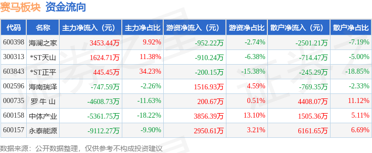从资金流向上来看,当日赛马板块主力资金净流出1.43亿元,游资资金净流入6461.99万元,散户资金净流入7844.76万元。赛马板块个股资金流向见下表: