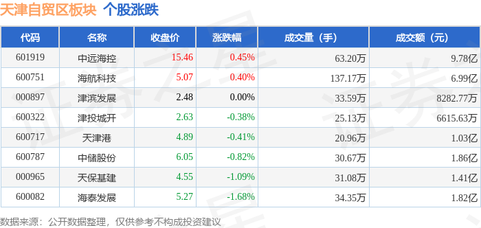 证券之星消息,11月12日天津自贸区板块较上一交易日上涨0.26%,中远海控领涨。当日上证指数报收于4000.14,下跌0.07%。深证成指报收于13240.62,下跌0.36%。天津自贸区板块个股涨跌见下表: