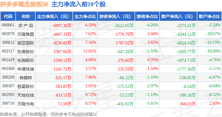 从资金流向上来看,当日拼多多概念股板块主力资金净流出4.58亿元,游资资金净流入1.01亿元,散户资金净流入3.57亿元。拼多多概念股板块个股资金流向见下表: