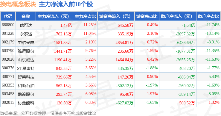 从资金流向上来看,当日换电概念板块主力资金净流出18.31亿元,游资资金净流入6.98亿元,散户资金净流入11.33亿元。换电概念板块个股资金流向见下表: