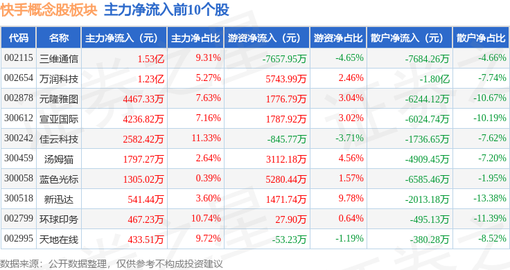 从资金流向上来看,当日快手概念股板块主力资金净流出7.81亿元,游资资金净流入3.95亿元,散户资金净流入3.86亿元。快手概念股板块个股资金流向见下表: