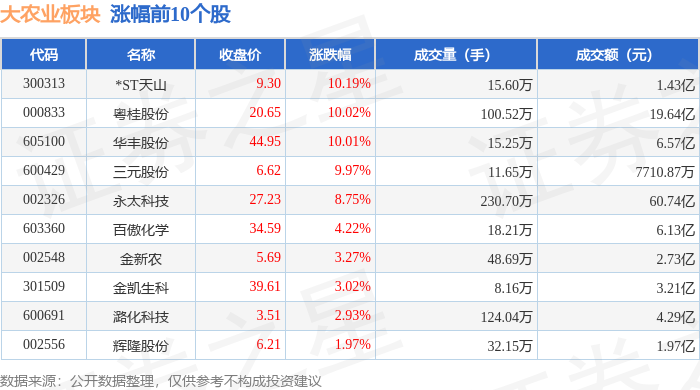 证券之星消息,11月12日大农业板块较上一交易日下跌0.6%,邦基科技领跌。当日上证指数报收于4000.14,下跌0.07%。深证成指报收于13240.62,下跌0.36%。大农业板块个股涨跌见下表: