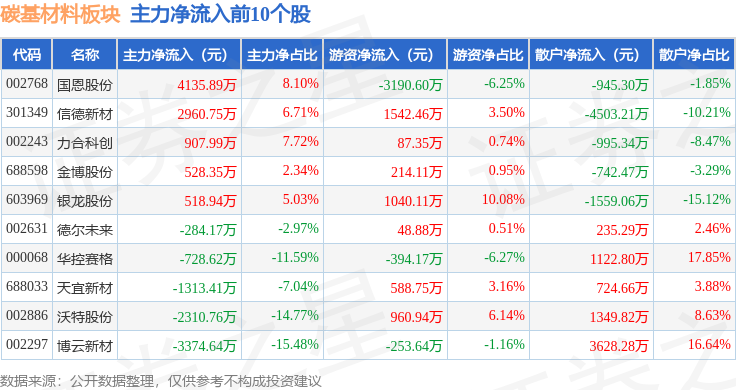 从资金流向上来看,当日碳基材料板块主力资金净流出5.83亿元,游资资金净流入9238.67万元,散户资金净流入4.91亿元。碳基材料板块个股资金流向见下表: