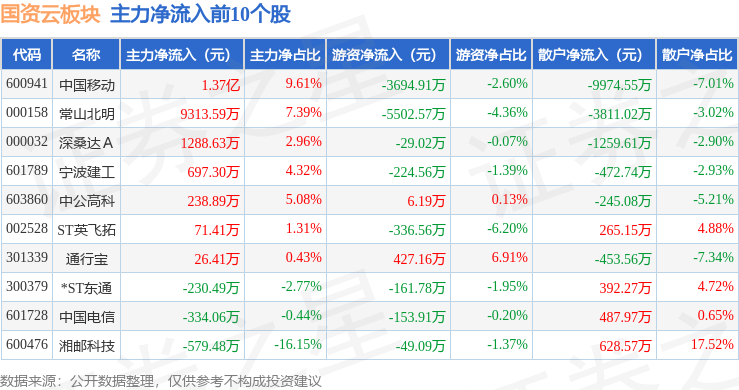 从资金流向上来看,当日国资云板块主力资金净流出15.87亿元,游资资金净流入2.81亿元,散户资金净流入13.06亿元。国资云板块个股资金流向见下表: