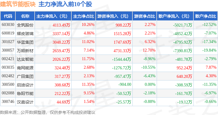 从资金流向上来看,当日建筑节能板块主力资金净流出1.17亿元,游资资金净流入9224.15万元,散户资金净流入2451.41万元。建筑节能板块个股资金流向见下表: