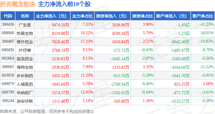 从资金流向上来看,当日肝炎概念板块主力资金净流入2.66亿元,游资资金净流入1.58亿元,散户资金净流出4.24亿元。肝炎概念板块个股资金流向见下表: