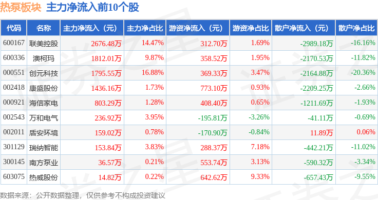 从资金流向上来看,当日热泵板块主力资金净流出3.16亿元,游资资金净流入1.51亿元,散户资金净流入1.65亿元。热泵板块个股资金流向见下表: