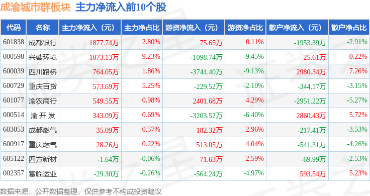从资金流向上来看,当日成渝城市群板块主力资金净流出2.5亿元,游资资金净流出2939.68万元,散户资金净流入2.79亿元。成渝城市群板块个股资金流向见下表: