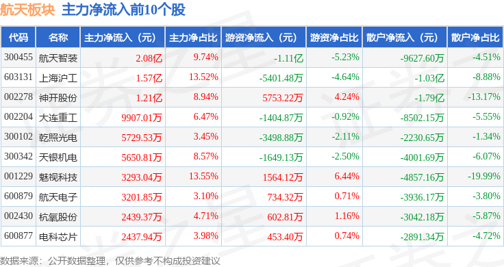 从资金流向上来看,当日航天板块主力资金净流出20.91亿元,游资资金净流入1.45亿元,散户资金净流入19.46亿元。航天板块个股资金流向见下表:
