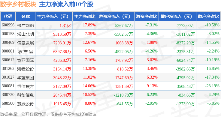 从资金流向上来看,当日数字乡村板块主力资金净流出11.55亿元,游资资金净流入1.61亿元,散户资金净流入9.94亿元。数字乡村板块个股资金流向见下表: