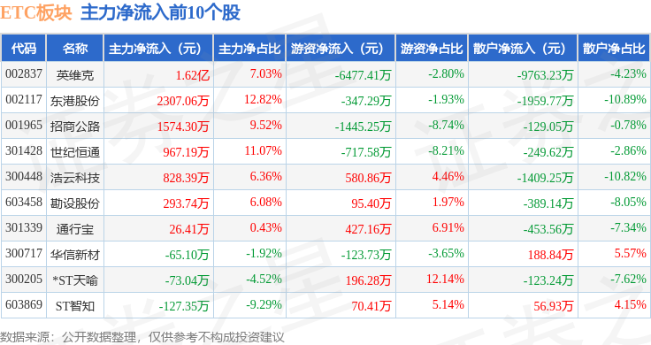 从资金流向上来看,当日ETC板块主力资金净流出14.64亿元,游资资金净流入3.12亿元,散户资金净流入11.53亿元。ETC板块个股资金流向见下表: