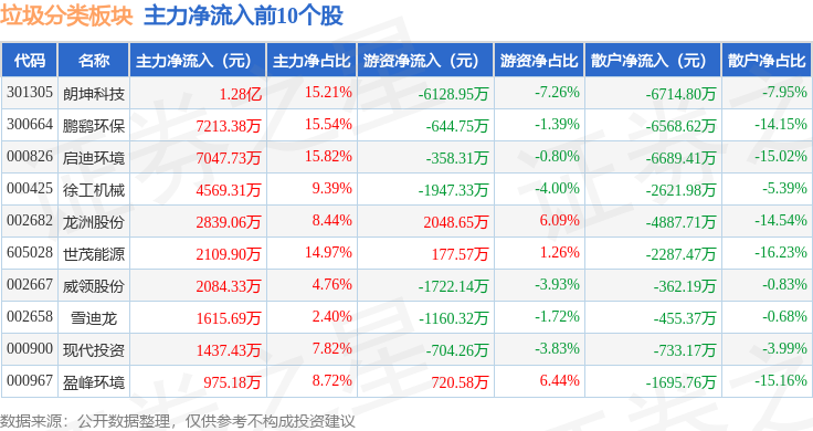 从资金流向上来看,当日垃圾分类板块主力资金净流出13.41亿元,游资资金净流入2.63亿元,散户资金净流入10.79亿元。垃圾分类板块个股资金流向见下表: