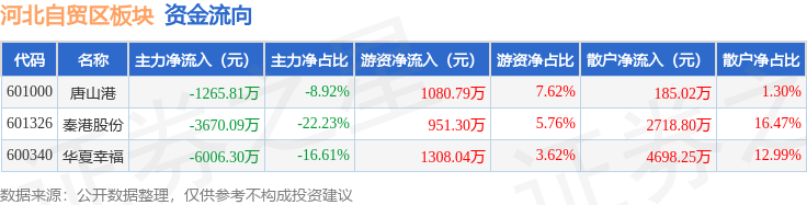 从资金流向上来看,当日河北自贸区板块主力资金净流出1.09亿元,游资资金净流入3340.14万元,散户资金净流入7602.07万元。河北自贸区板块个股资金流向见下表: