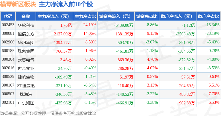 从资金流向上来看,当日横琴新区板块主力资金净流出2510.85万元,游资资金净流出401.61万元,散户资金净流入2912.47万元。横琴新区板块个股资金流向见下表: