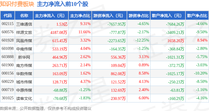从资金流向上来看,当日知识付费板块主力资金净流出3.05亿元,游资资金净流出131.91万元,散户资金净流入3.06亿元。知识付费板块个股资金流向见下表: