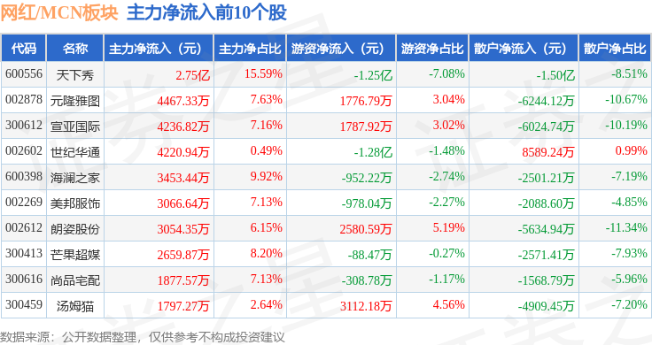 从资金流向上来看,当日网红/MCN板块主力资金净流出12.07亿元,游资资金净流入2.12亿元,散户资金净流入9.94亿元。网红/MCN板块个股资金流向见下表: